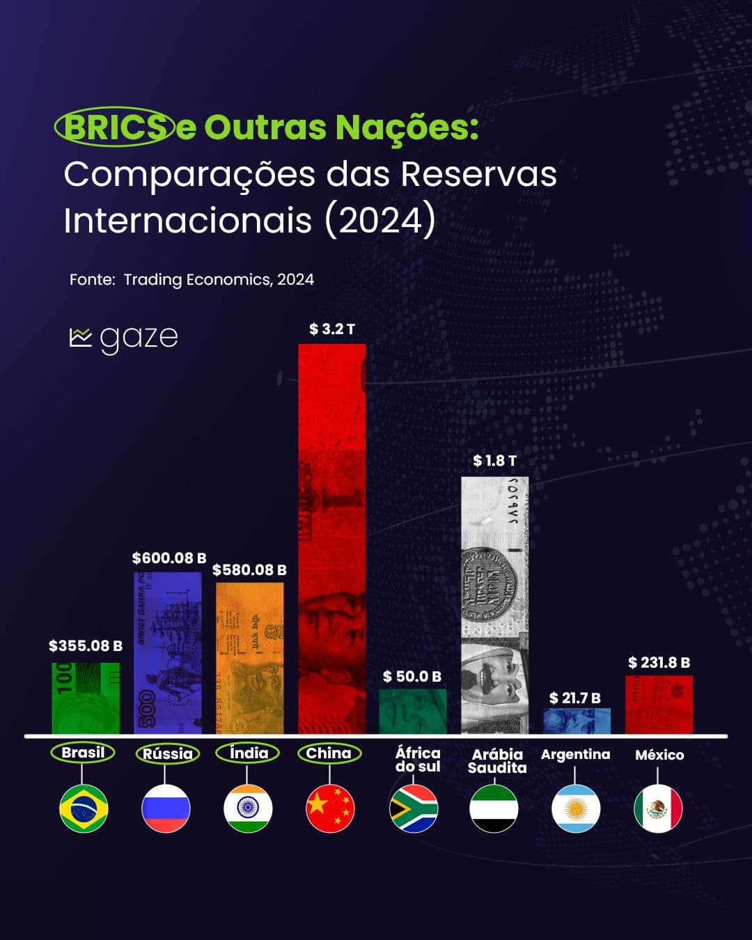 Quando se trata de reservas internacionais em dólar, cada país tenta mostrar que está preparado para os altos e baixos da economia global. E, apesar de não estar no topo, o Brasil não faz feio, com suas respeitáveis reservas de US$ 355 bilhões. Talvez não seja um número impressionante perto da China, que lidera com US$ 3,2 trilhões (sim, trilhões!), mas, no cenário dos BRICS, o Brasil consegue se destacar.